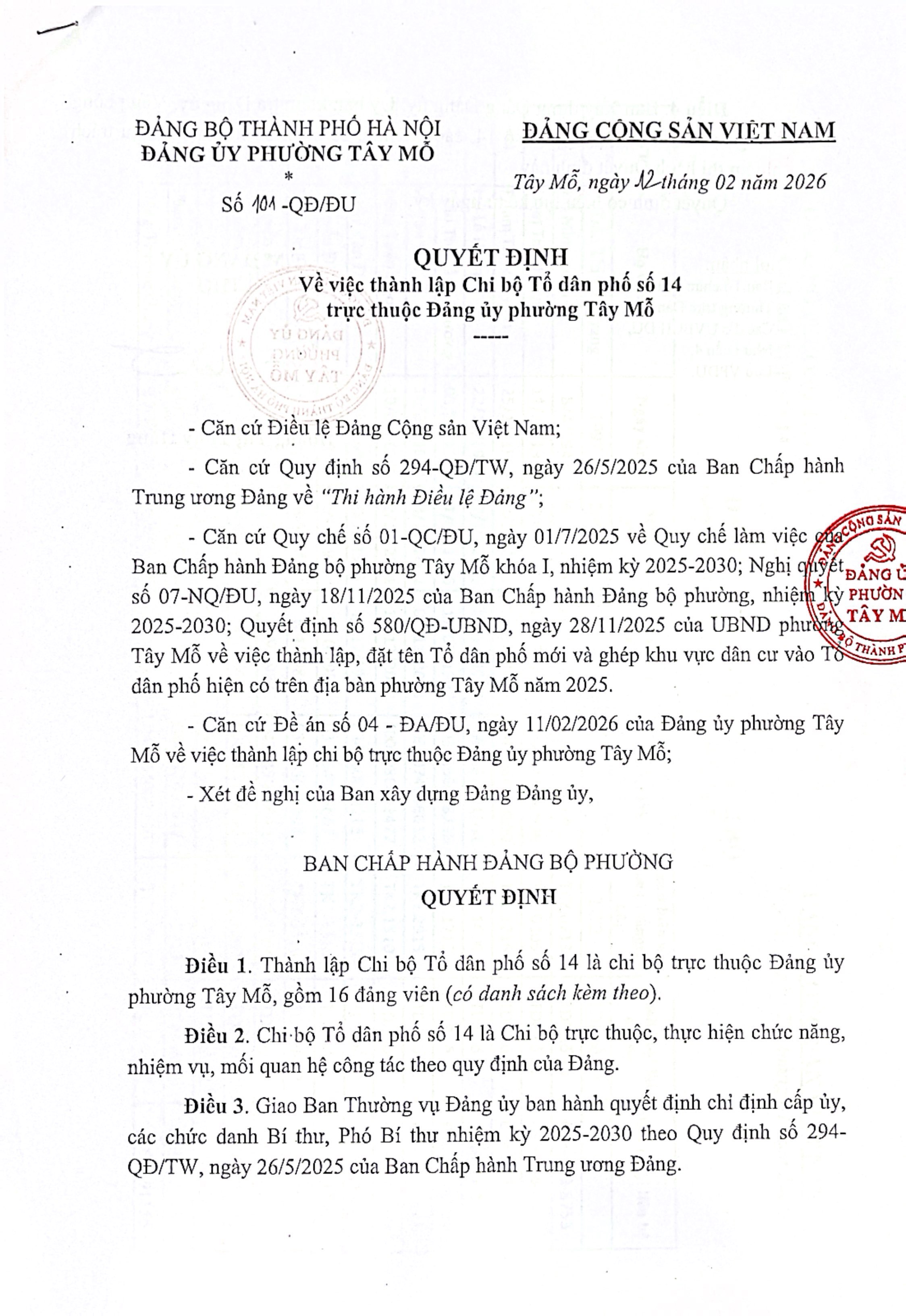 Căn cứ Quyết định số 101-QĐ/ĐU ngày 12/02/2026 của Đảng uỷ phường Tây Mỗ về việc thành lập Chi bộ Tổ dân phố 14;