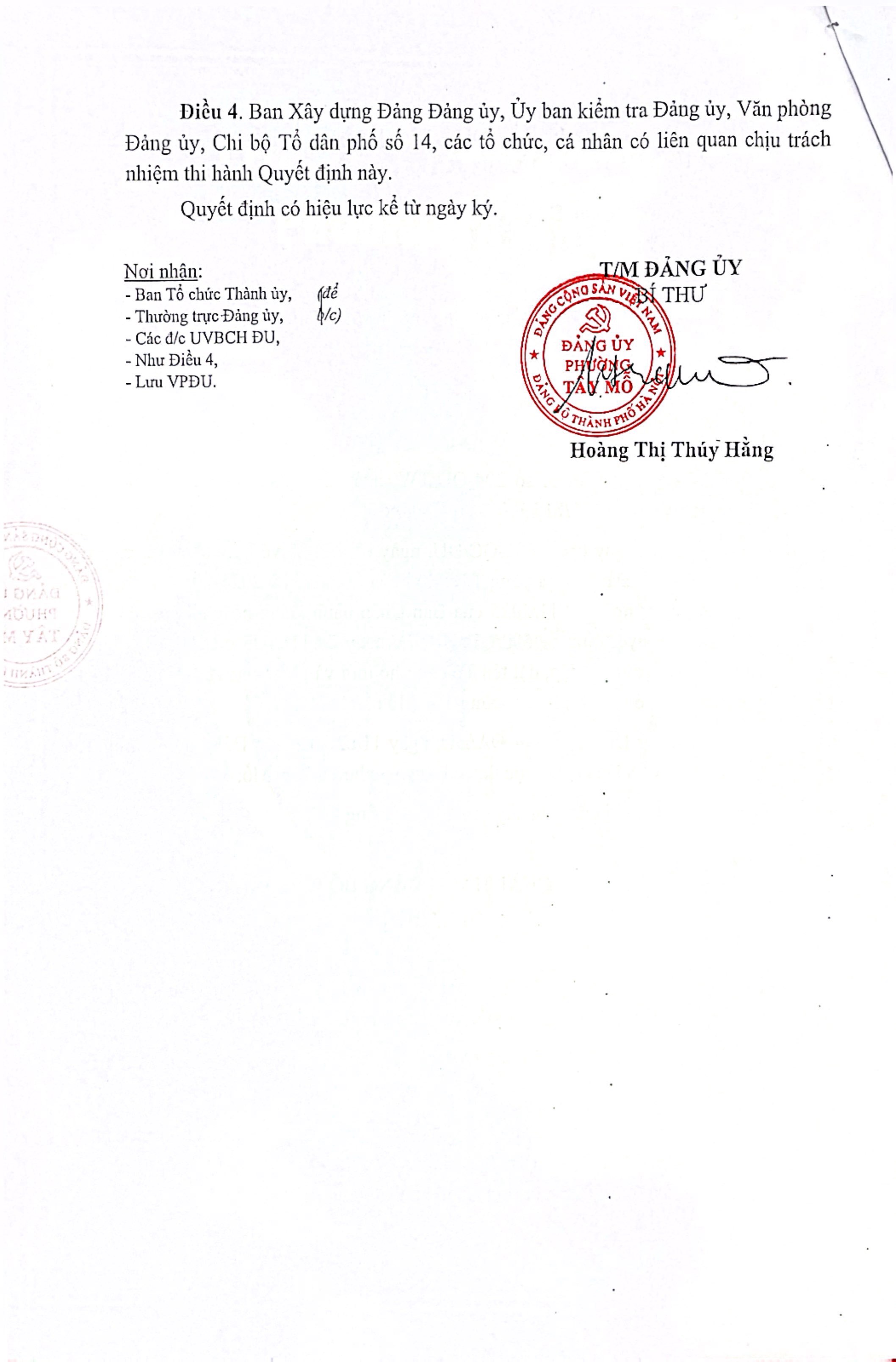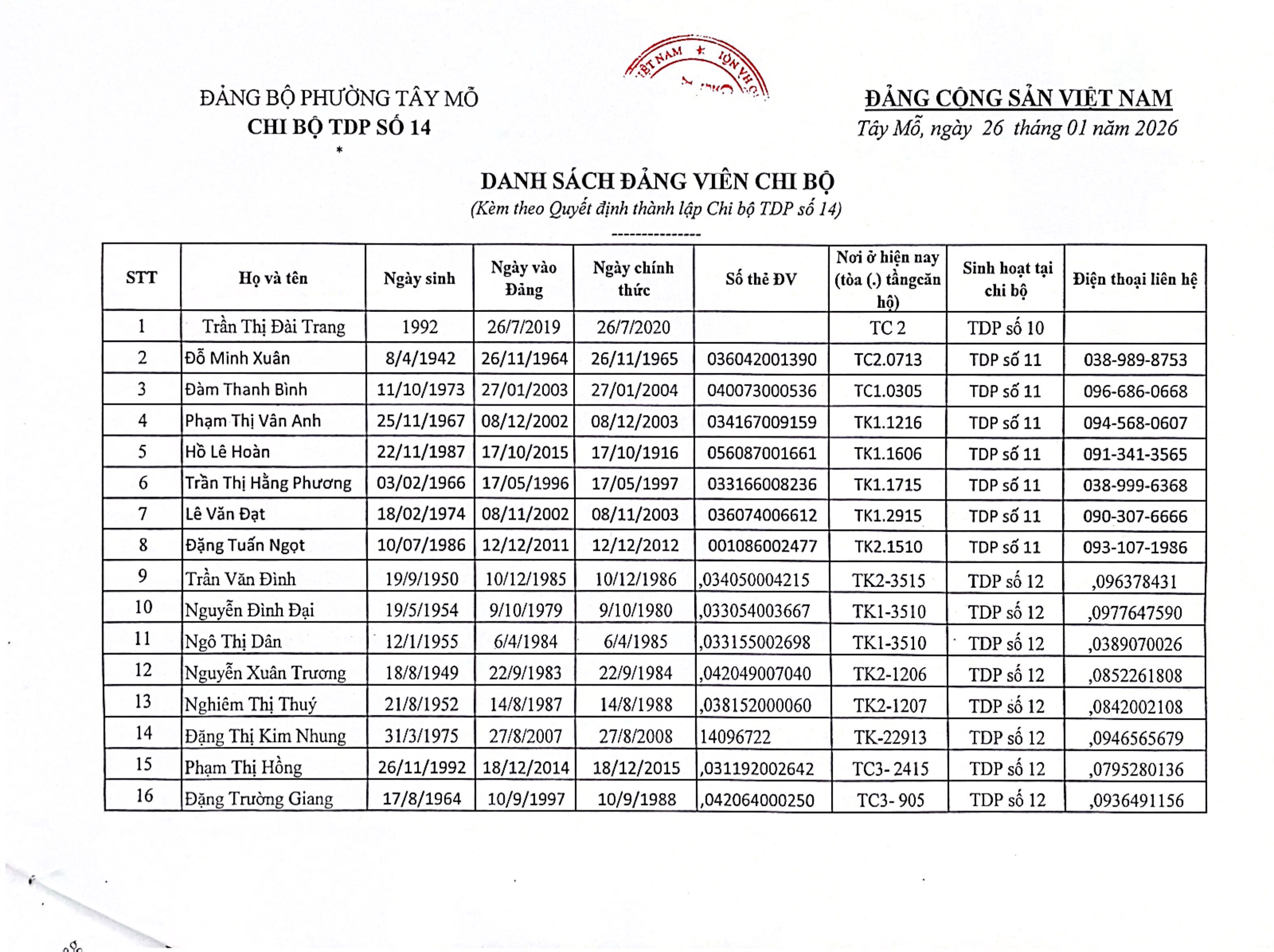 Thành lập Chi bộ Tổ dân phố 14 trực thuộc Đảng uỷ phường Tây Mỗ, gồm 16 đảng viên (có danh sách kèm theo).