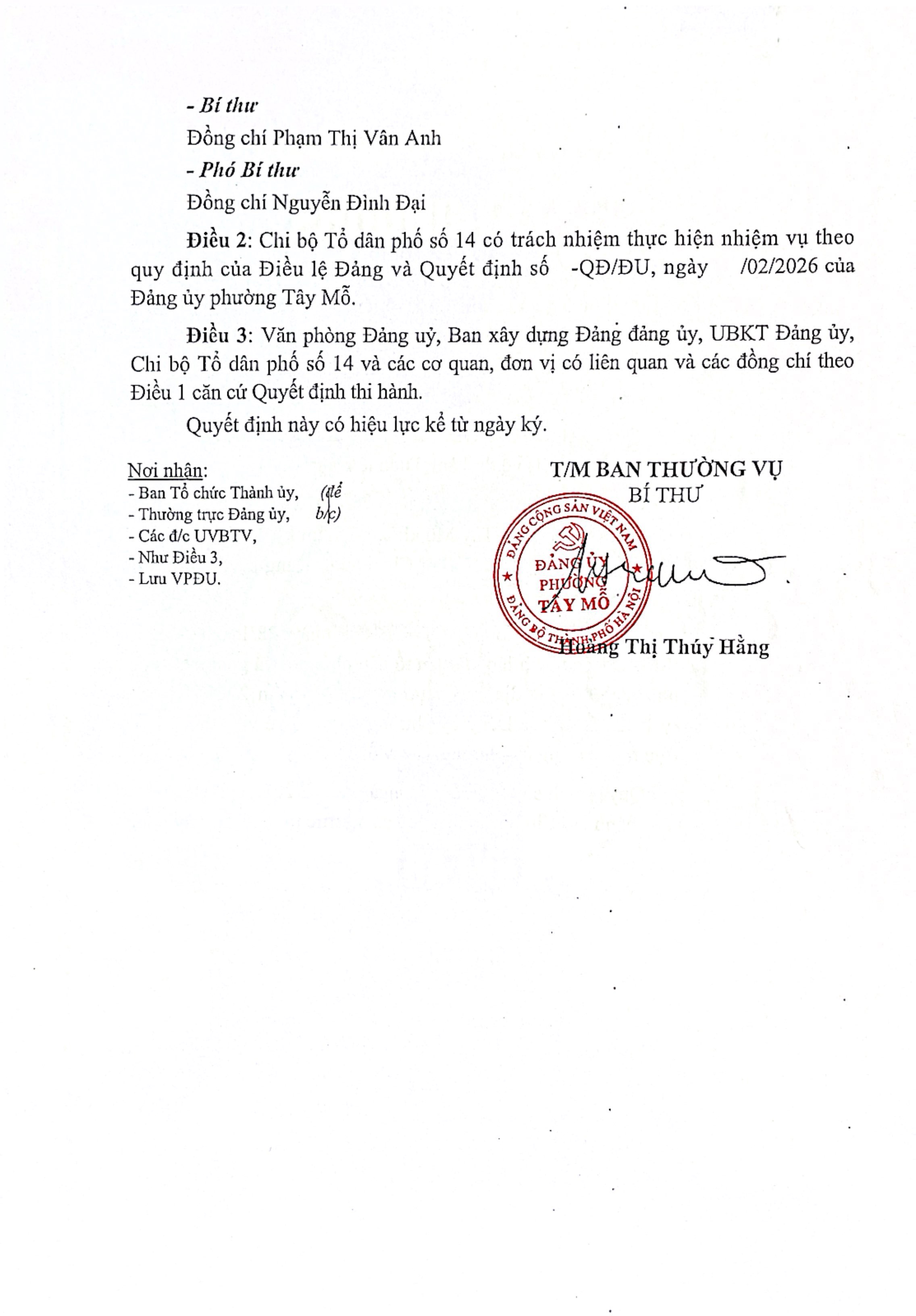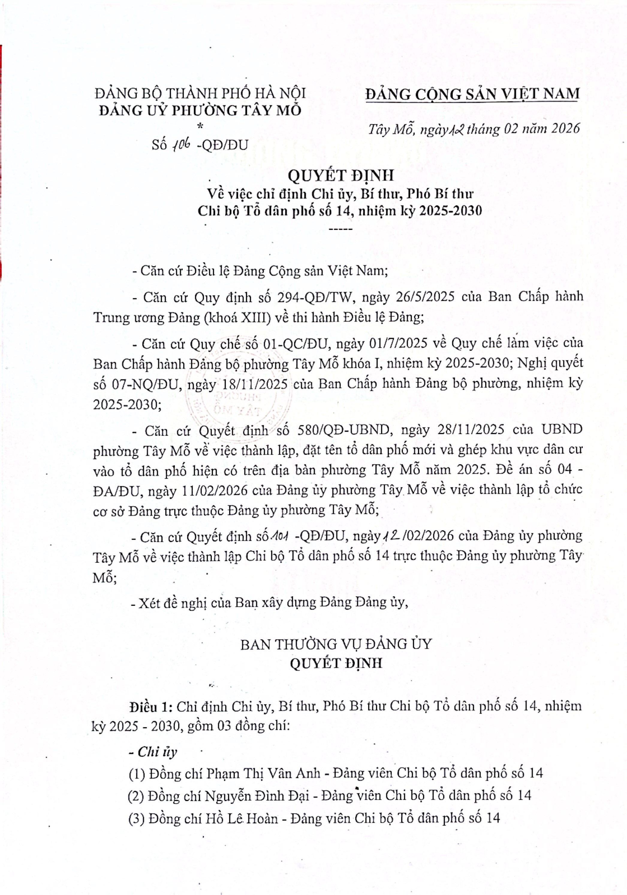 Căn cứ Quyết định số 106-QĐ/ĐU ngày 12/02/2026 của Đảng uỷ phường Tây Mỗ về việc chỉ định Chi uỷ, Bí thư, Phó Bí thư Chi bộ Tổ dân phố 14 nhiệm kỳ 2025–2030;