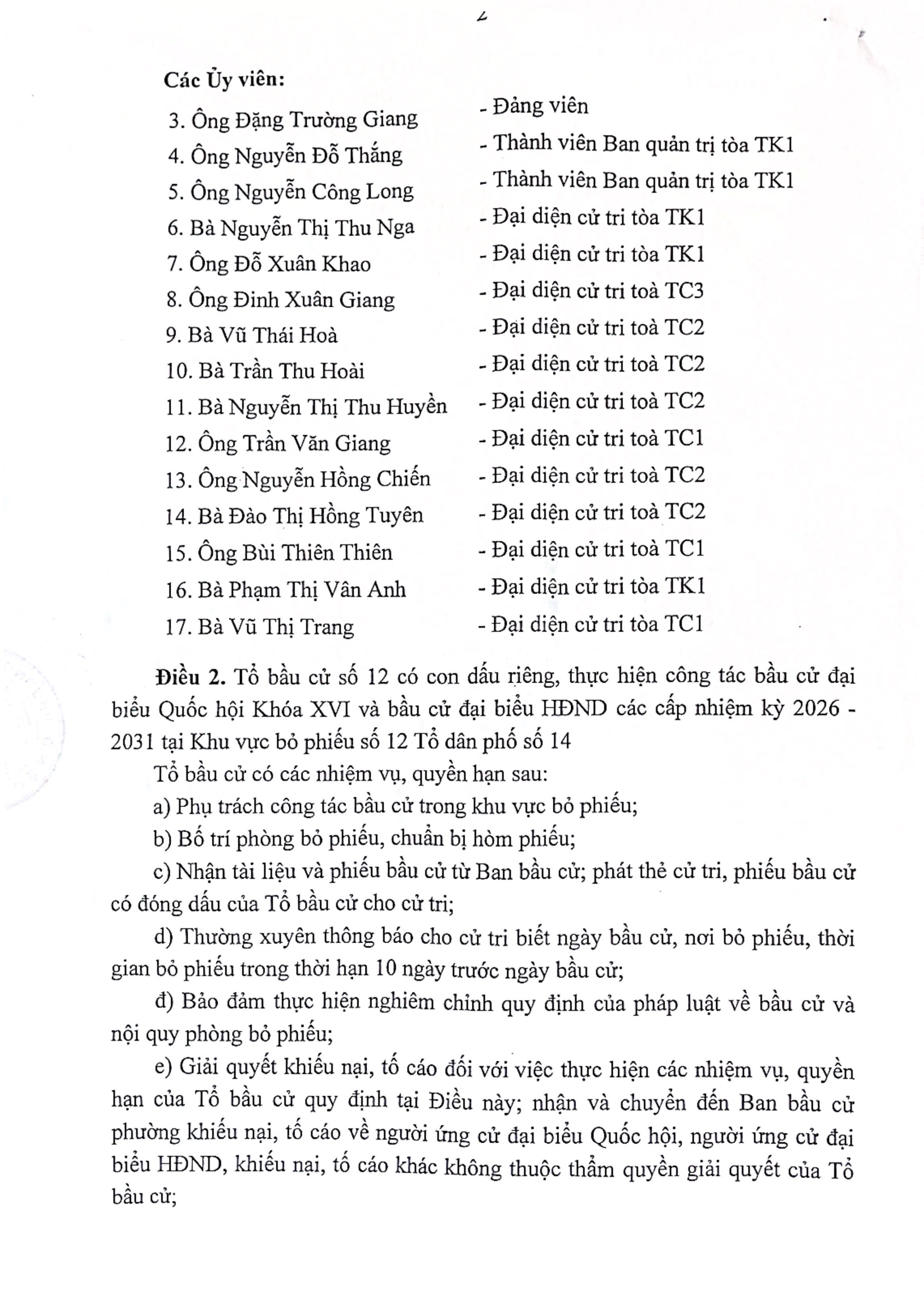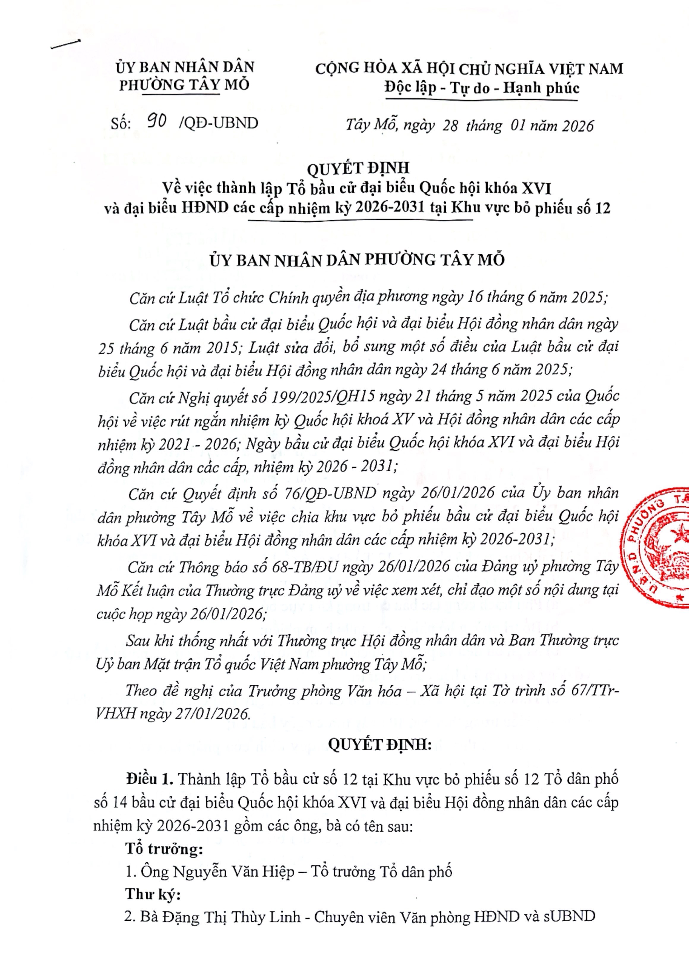 UBND phường Tây Mỗ đã ban hành Quyết định số 90/QĐ-UBND ngày 28/01/2026 về việc thành lập Tổ bầu cử đại biểu Quốc hội và đại biểu Hội đồng nhân dân các cấp nhiệm kỳ 2026–2031 tại Khu vực bỏ phiếu số 12 trên địa bàn TDP 14.